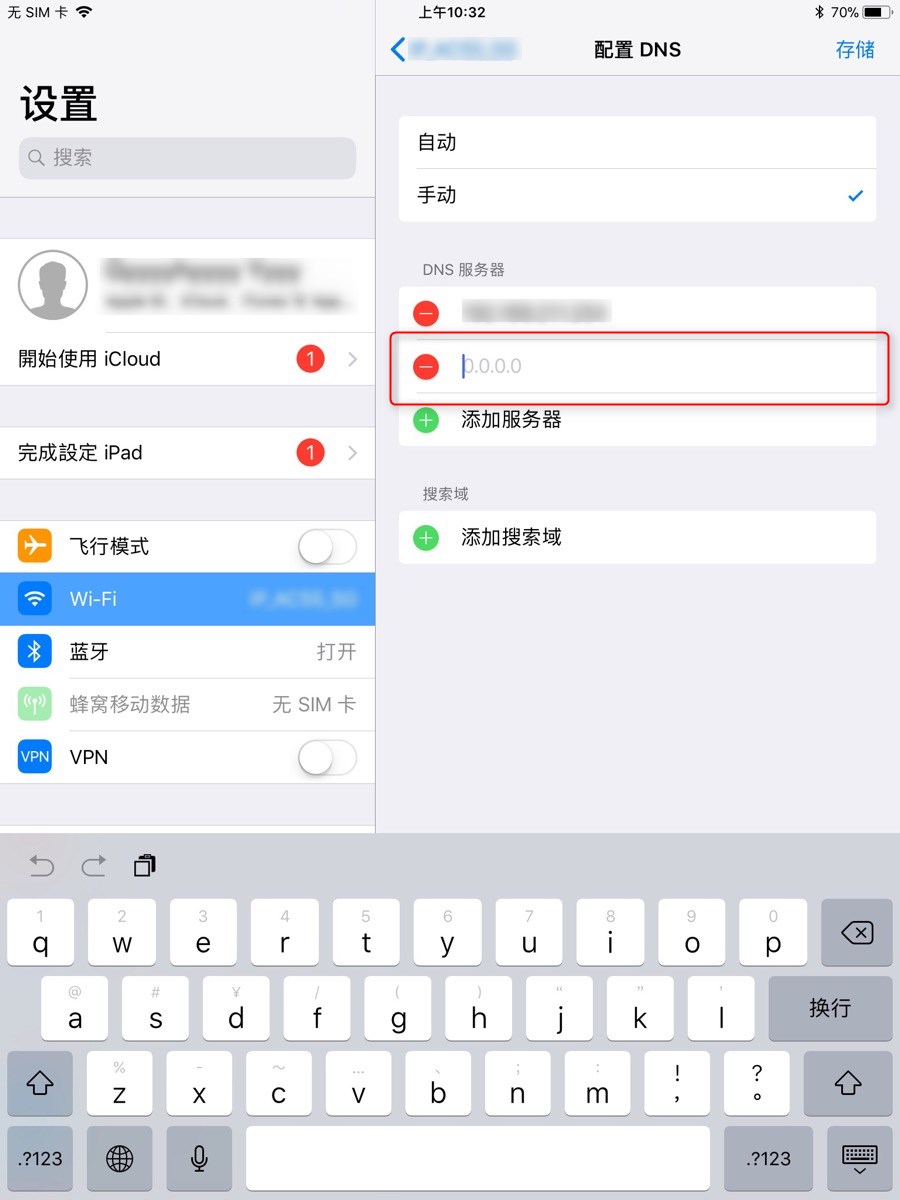 5. 在弹出的键盘上输入您需要更改的 DNS 数值, 本例子中我们使用 “ 8.8.8.8 ”